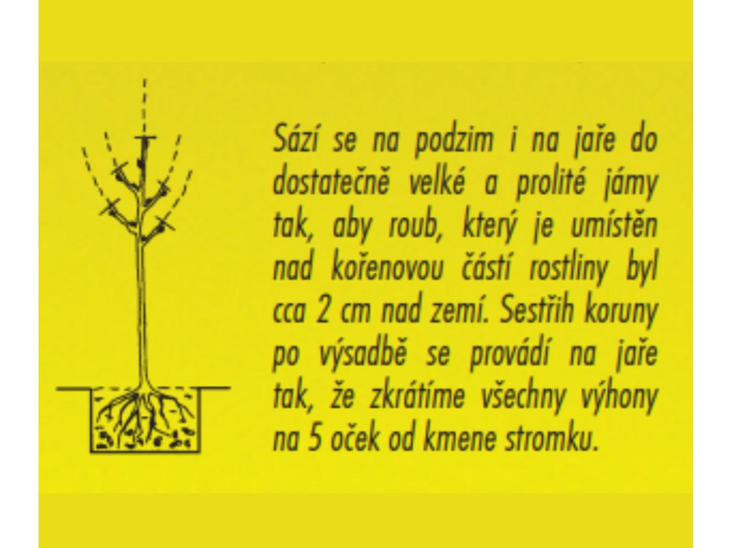 Sprašnost cizosprašná, opyl. Althanova, Zel. RenklodaPlod velký kulovitý, sladce navinulýPlodnost brzkáZralost raná, 1. polovina srpnaOdolnost nenáročná, střední proti šarce